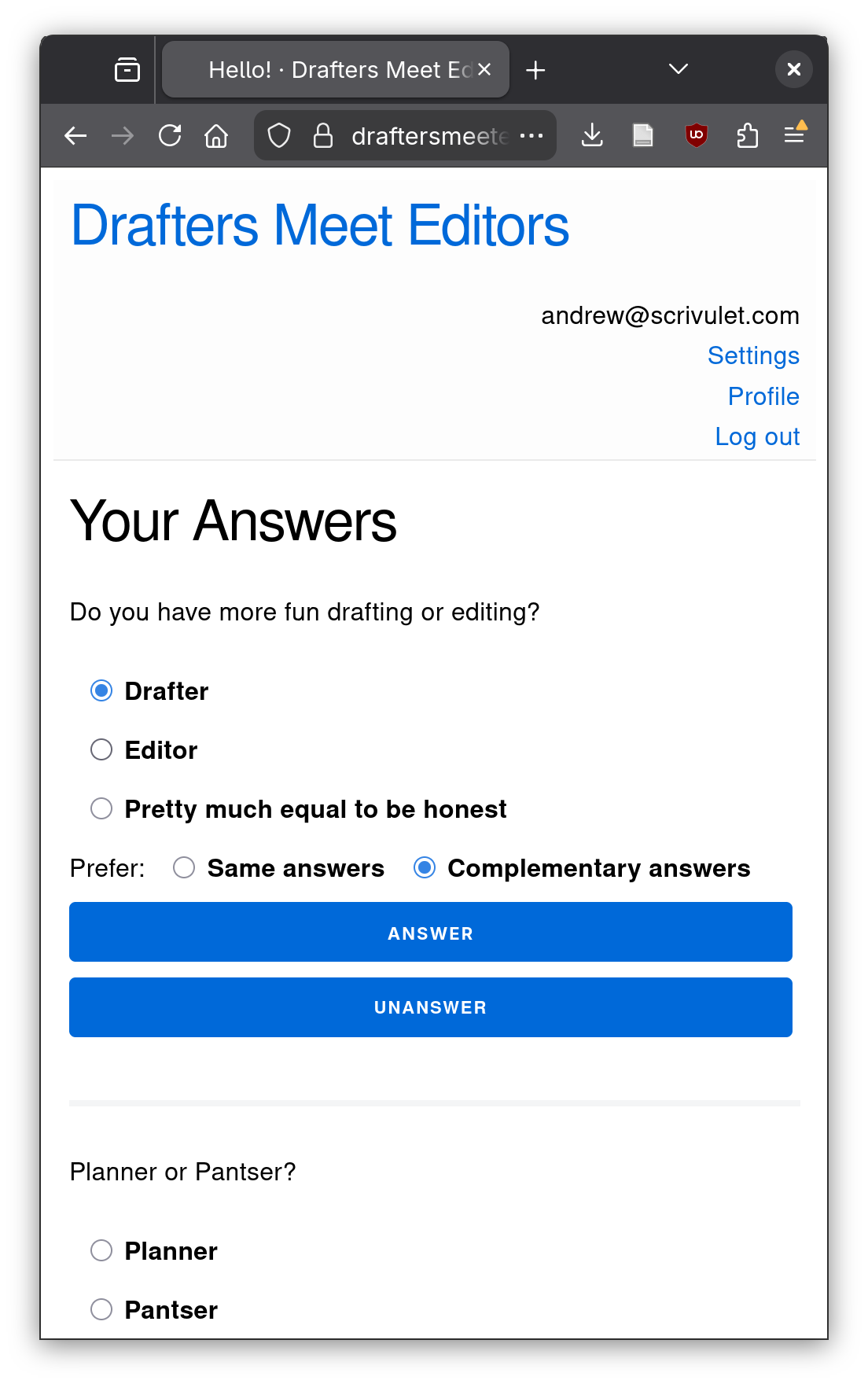 So basically I built a simple matchmaking site for writers who want to participate in this hypothetical style of working relationship. It features compatibility questions about the obvious drafter/editor preference, but also miscellaneous other working style questions. It has writing samples instead of profile pictures. I figure if nothing else, it can serve as a fun personality quiz site for writers to share their style.