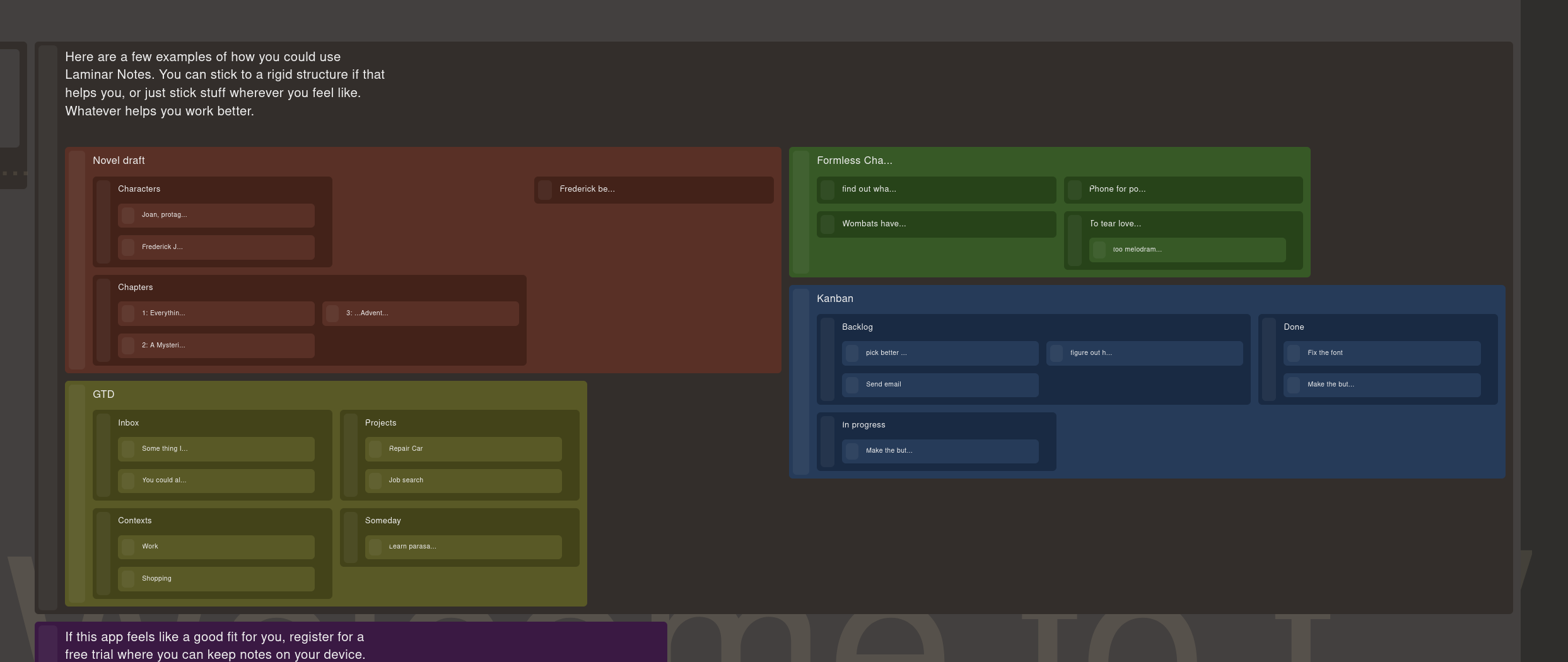 I've always been dissatisfied with the various note-taking software, outliners, mind-mappers, and other tools for keeping track of ones ideas. They felt too restrictive. I often come up with an idea without knowing exactly where it should fit into any existing organization structure. My (still in-progress) answer is Laminar Notes